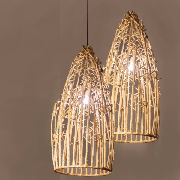 Bamboo Twigs Lamps are inspired by the vastness of the bamboo forest of Tadeco farm. The lamps are made from abaca fibers coiled with silver wires. Twig lamps are woven by skilled artisans in Mindanao. It comes in 3 sizes and colors.